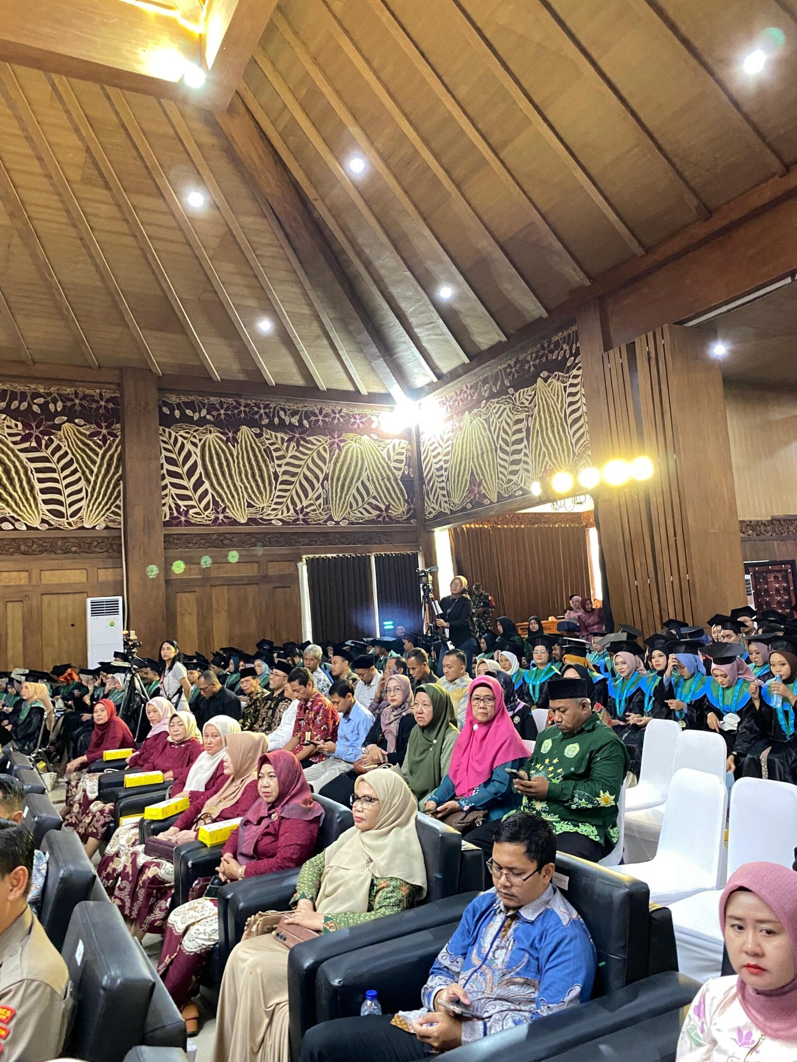 Prosesi wisuda diawali dengan penyampaian laporan akademik oleh Rektor, kemudian dilanjutkan dengan pengukuhan sarjana dari berbagai fakultas. Panggung utama tampil megah dengan tata visual bernuansa etnik modern, lengkap dengan bendera fakultas yang tersusun serasi di sisi kiri dan kanan. Pada barisan depan tampak jajaran pimpinan universitas mengenakan toga dengan warna khas yang melambangkan kewenangan akademik masing-masing. Sorotan lampu di area panggung memberikan kesan formal namun tetap hangat bagi seluruh peserta yang hadir.