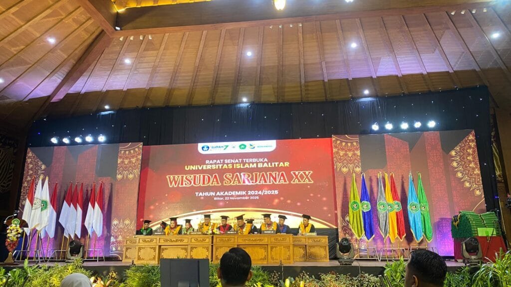 Ketua Pengadilan Agama Blitar menghadiri Rapat Senat Terbuka Universitas Islam Balitar pada Wisuda Sarjana XX Tahun Akademik 2024/2025 yang diselenggarakan di Kampung Coklat Blitar pada Sabtu, 22 November 2025. Acara berlangsung di auditorium utama Kampung Coklat dengan formasi lengkap para petinggi universitas yang mengenakan atribut akademik resmi.