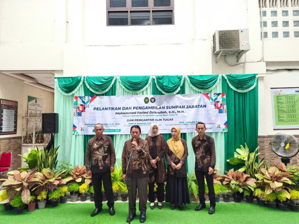 BLITAR, 25 September 2025 – Kamis yang cerah di Kota Blitar menjadi saksi bisu dari sebuah momentum penting dalam perjalanan reformasi birokrasi di lingkungan peradilan agama. Aula Pengadilan Agama (PA) Blitar Kelas IA pagi itu diselimuti suasana khidmat yang bercampur dengan kehangatan kekeluargaan. Seluruh mata tertuju pada rangkaian acara Pelantikan dan Pengambilan Sumpah Jabatan Sekretaris PA Blitar yang baru, Bapak Mohammad Faried Dzikrullah, S.H., M.H., yang diselenggarakan bersamaan dengan acara Pengantar Alih Tugas bagi tiga Pejabat Berprestasi yang akan melanjutkan pengabdian mereka di satuan kerja lain.