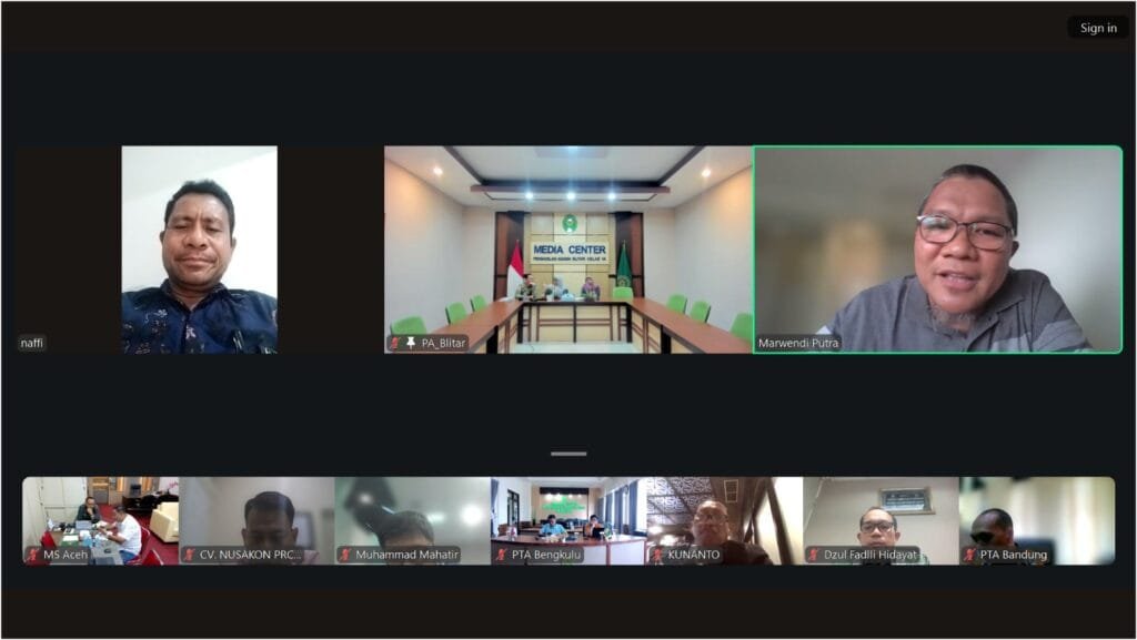 Pengadilan Agama (PA) Blitar mengikuti Rapat Persiapan Pelaksanaan Perencanaan Desain Tata Ruang Pembangunan Gedung Kantor yang digelar secara daring pada Jumat, 21 November 2025 pukul 09.00 WIB melalui Zoom. Kegiatan ini diikuti dari Ruang Media Center PA Blitar oleh Ketua, Sekretaris, serta Pejabat Pembuat Komitmen (PPK). Rapat diselenggarakan oleh Badan Urusan Administrasi (BUA) Mahkamah Agung RI dan dihadiri oleh sejumlah satuan kerja, termasuk PA Sumedang, PA Pandegelang, PA Blitar, serta Mahkamah Syariah Blangkejeren.