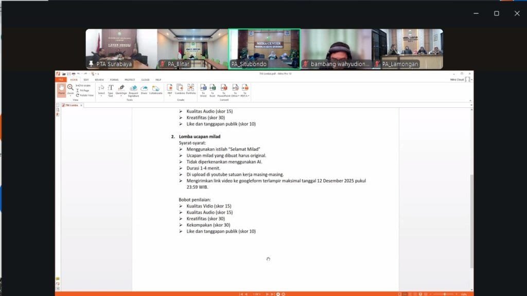 Pengadilan Agama Blitar mengikuti technical meeting terkait Lomba Cipta Mars dan Lomba Ucapan Selamat Milad Pengadilan Tinggi Agama Surabaya yang digelar secara daring pada Rabu, 26 November 2025 pukul 13.30 WIB. Kegiatan berlangsung di Ruang Media Center dan diikuti oleh Kasubbag PTIP Shohib Hasan bersama Tim IT.