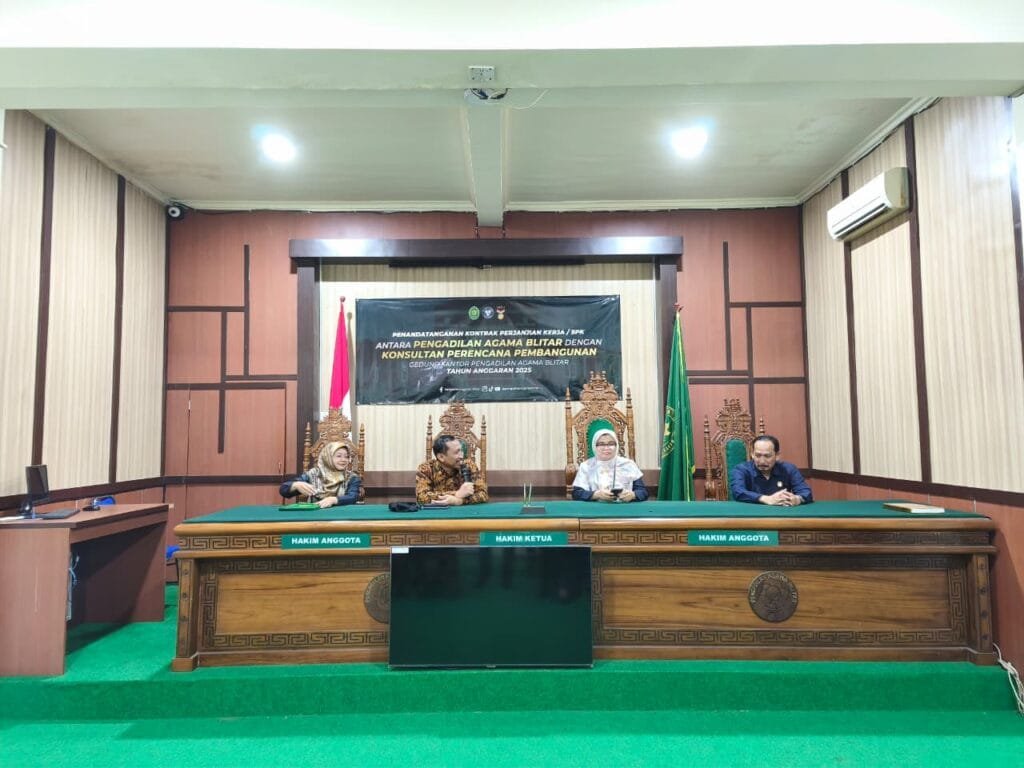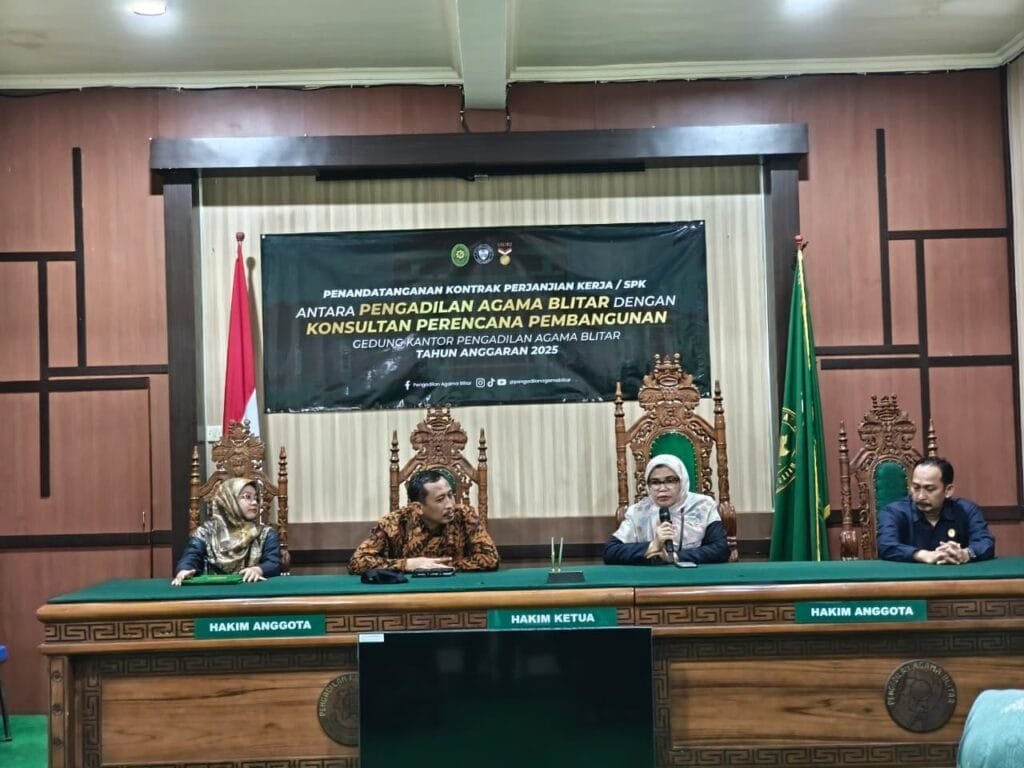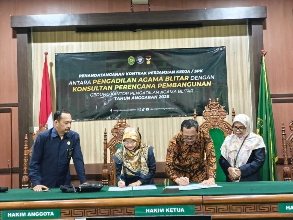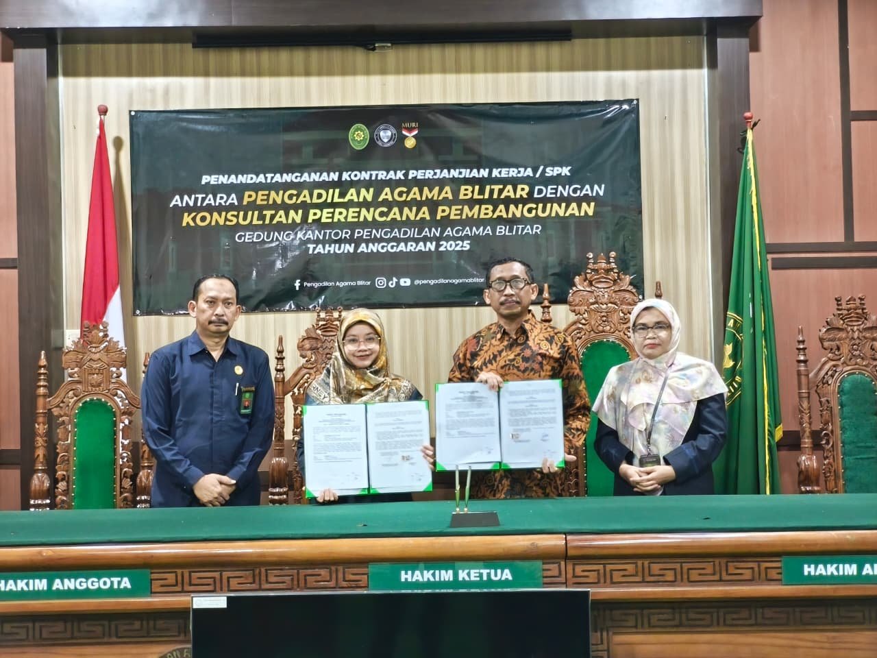 Pengadilan Agama Blitar menggelar penandatanganan kontrak kerja atau Surat Perintah Kerja (SPK) dengan konsultan perencana pembangunan Gedung Kantor Pengadilan Agama Blitar Tahun Anggaran 2025 pada Rabu, 19 November 2025 pukul 13.00 WIB. Kegiatan berlangsung di kantor Pengadilan Agama Blitar dan dihadiri oleh Ketua, Sekretaris, Pejabat Pembuat Komitmen (PPK), serta Direktur CV Nusakom selaku konsultan perencana.